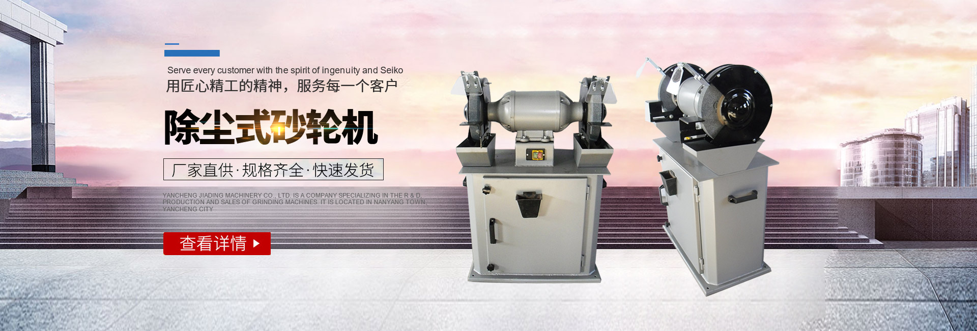 鹽城嘉鼎機(jī)械有限公司是一家專業(yè)從事砂輪機(jī)研發(fā)、生產(chǎn)、銷售為一體的公司,坐落在鹽城市南洋鎮(zhèn)。主要產(chǎn)品有:砂輪機(jī)、砂帶機(jī)等系列。其中砂輪機(jī)有:臺式、立式、懸掛式、除塵式、它驅(qū)式、防爆式等三十多個規(guī)格品種,也可定制特殊行業(yè)所需的異型砂輪機(jī)。